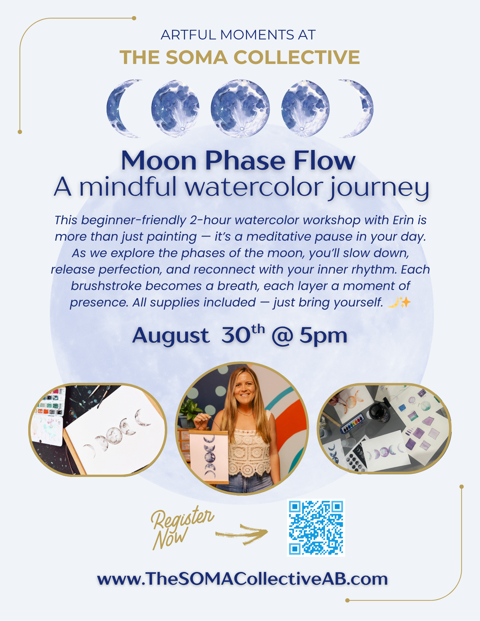 This beginner-friendly 2-hour watercolor workshop with Erin is more than just painting — it’s a meditative pause in your day. As we explore the phases of the moon, you’ll slow down, release perfection, and reconnect with your inner rhythm. Each brushstroke becomes a breath, each layer a moment of presence. All supplies included — just bring yourself. 🌙✨
